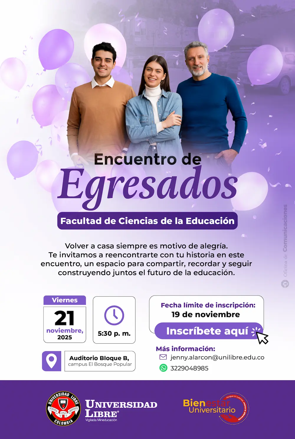 El próximo viernes 21 de noviembre de 2025, la Facultad de Ciencias de la Educación de la Universidad Libre Seccional Bogotá celebrará su Encuentro de Egresados. La cita será a las 5:30 p. m. en el Auditorio del Bloque B del campus El Bosque Popular.