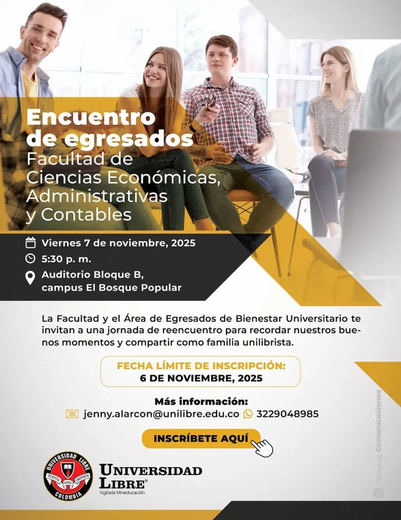 Con el propósito de fortalecer los lazos de amistad y pertenencia entre los graduados unilibristas, la Facultad de Ciencias Económicas, Administrativas y Contables realizará su Encuentro de Egresados el viernes 7 de noviembre, a las 5:30 p. m., en el auditorio Bloque B del campus El Bosque Popular.