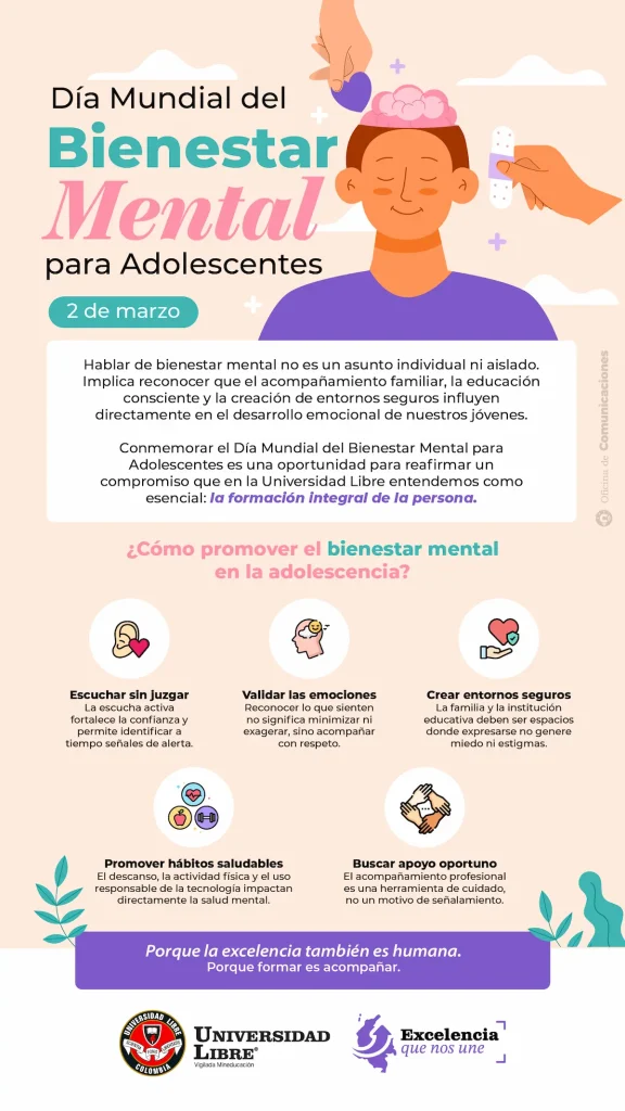 Este 2 de marzo, la Universidad Libre se une a la conmemoración del Día Mundial del Bienestar Mental para Adolescentes, una fecha que invita a reflexionar sobre la importancia de acompañar, escuchar y proteger a nuestros jóvenes en una etapa clave de su desarrollo.