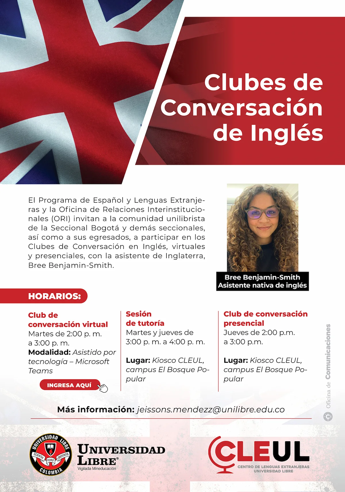 Las actividades se desarrollarán en modalidad virtual y presencial, con el acompañamiento de Bree Benjamin-Smith, asistente nativa de Inglaterra, quien apoyará las sesiones orientadas a la práctica conversacional y al fortalecimiento de la fluidez en inglés.