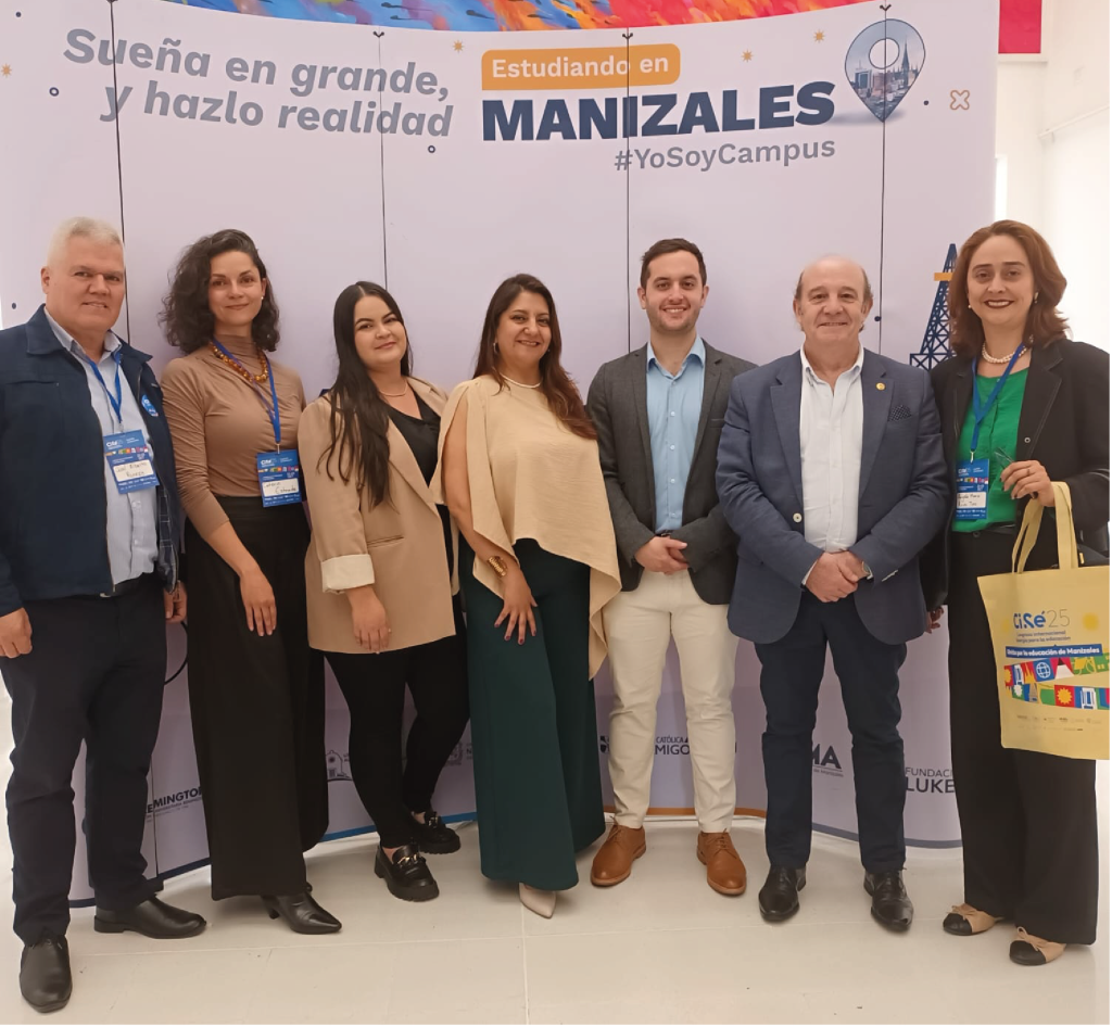 En la fotografía aparecen los representantes de las oficinas de relaciones internacionales de FUComfamiliar, Universidad de Manizales, Visión de las Américas, Universidad del Tolima y la Universidad Libre.