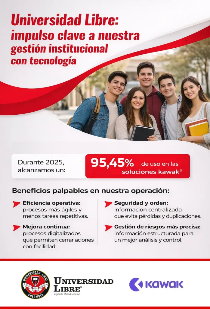 Durante 2025, la institución alcanzó un 95,45 % de uso en las soluciones de Kawak, una plataforma que apoya la gestión de procesos y la mejora continua. Esto hace parte de una gestión institucional con herramientas tecnológicas que contribuyen a una administración más eficiente.