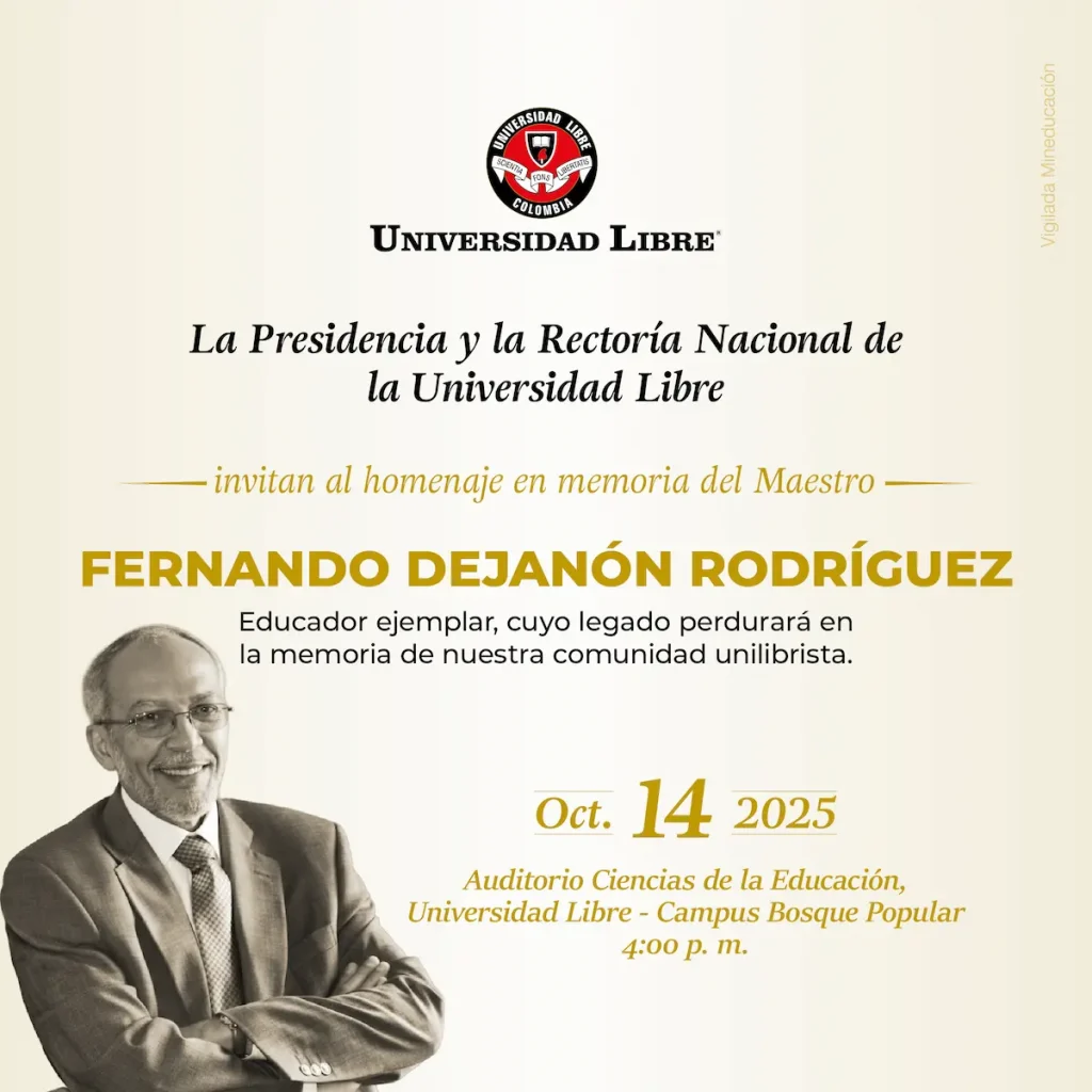 La Universidad Libre realizará un homenaje en memoria del maestro Fernando Dejanón Rodríguez, exrector de nuestra institución, como reconocimiento a su destacada labor docente y su invaluable aporte a la formación de generaciones unilibristas. Será un encuentro para exaltar su legado y recordar, con gratitud, su ejemplo de compromiso y vocación educativa.