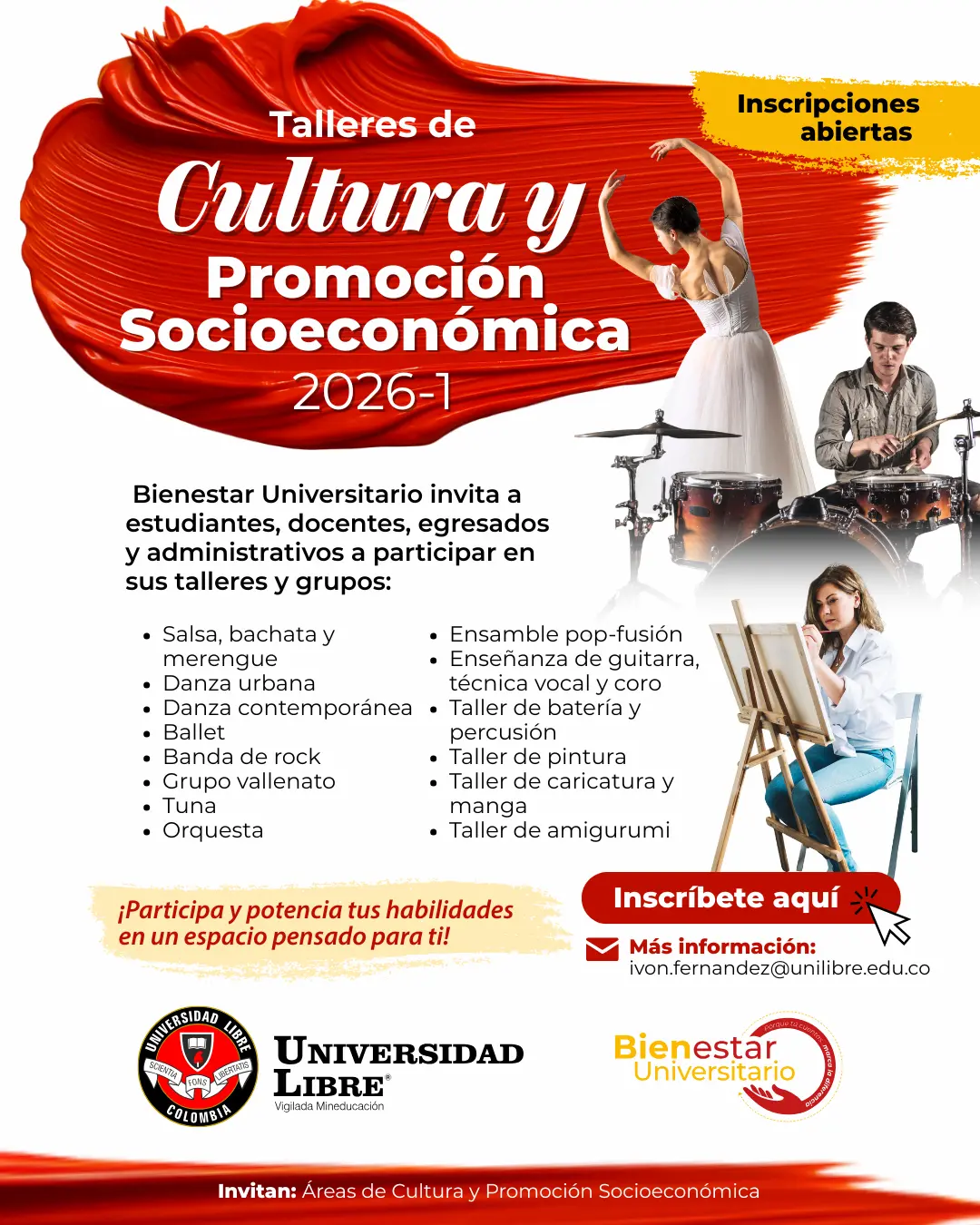 Bienestar Universitario abre inscripciones para los Talleres de Cultura y Promoción Socioeconómica 2026-1, una iniciativa dirigida a estudiantes, docentes y administrativos que busca fortalecer el talento artístico, creativo y formativo de la comunidad unilibrista durante el próximo semestre académico.