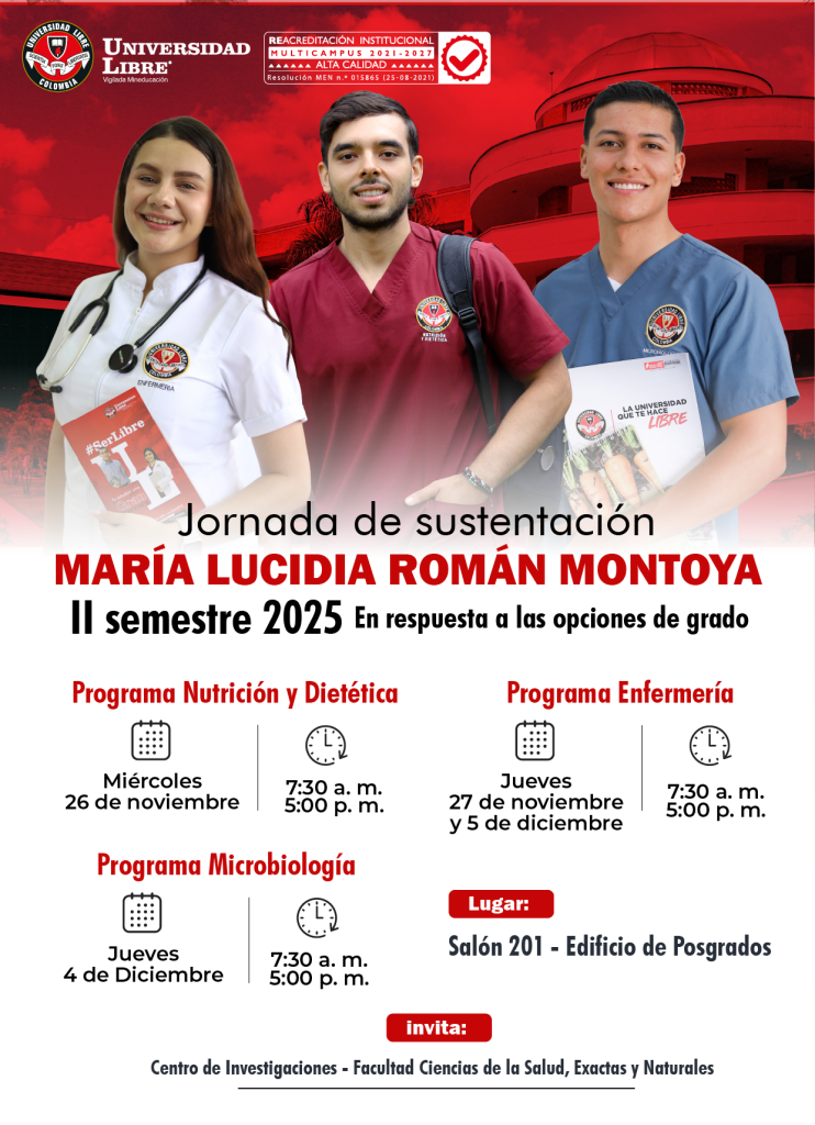 La Facultad de Ciencias de la Salud, Exactas y Naturales te invita a participar en la jornada académica donde se presentarán sustentaciones de grado en los siguientes programas: