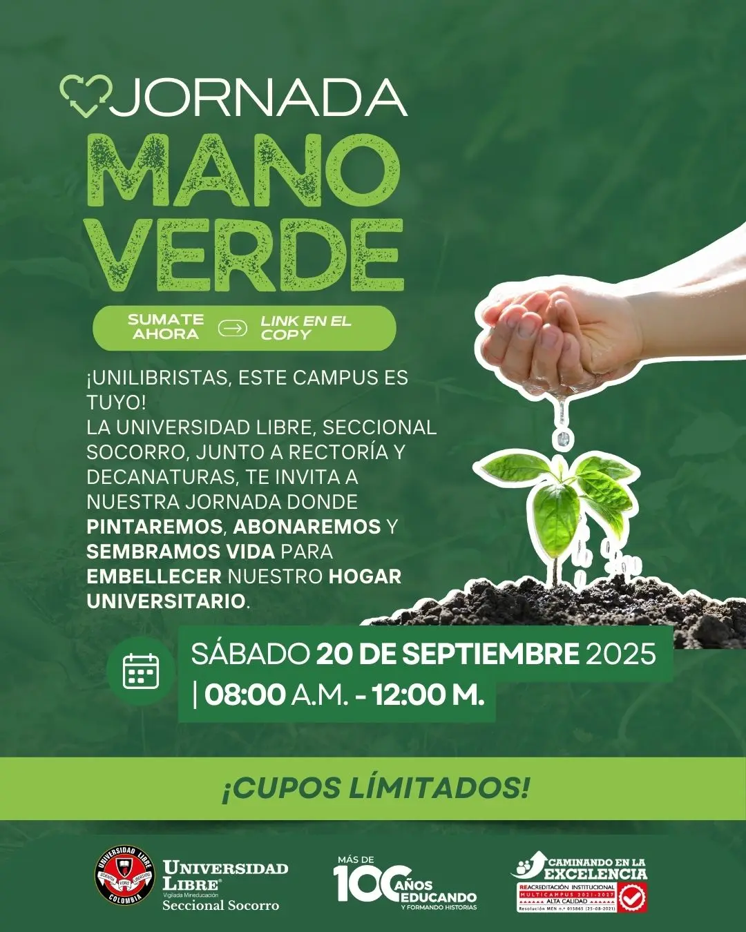 Durante dos semanas, estudiantes, administrativos y colaboradores de la Universidad Libre Seccional Socorro unieron esfuerzos en la Jornada Mano Verde, una experiencia que transformó el campus Majavita con nuevas pinturas, jardines renovados y espacios llenos de vida. Más allá de embellecer nuestro entorno, este encuentro reflejó el compromiso y el amor por nuestra universidad.