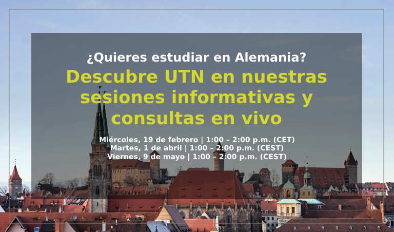 La Universidad de Tecnología de Núremberg (UTN) invita a los estudiantes interesados en sus programas académicos a participar en sesiones informativas en línea y consultas personalizadas para resolver dudas sobre el proceso de admisión y la experiencia universitaria en UTN.