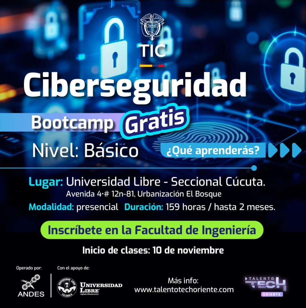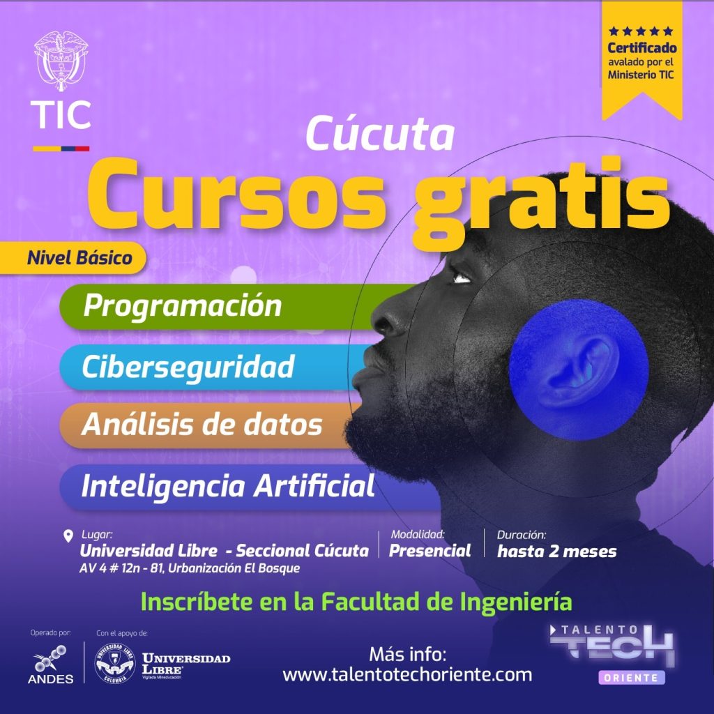 La Universidad Libre, seccional Cúcuta, será escenario del desarrollo de cuatro cursos gratuitos enfocados en Inteligencia Artificial, Programación, Ciberseguridad y Análisis de Datos, gracias a la alianza con el Ministerio de Tecnologías de la Información y las Comunicaciones (MinTIC), a través de un programa denominado ‘Talento Tech’.