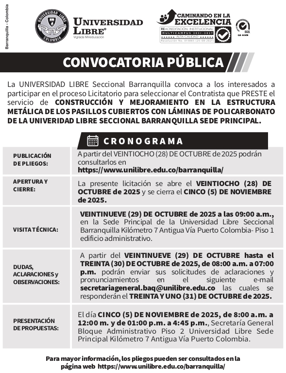 Licitación para la selección del contratista que preste el servicio de construcción y mejoramiento en la estructura metálica de los pasillos cubiertos con láminas de policarbonato de la Universidad Libre Seccional Barranquilla sede principal.