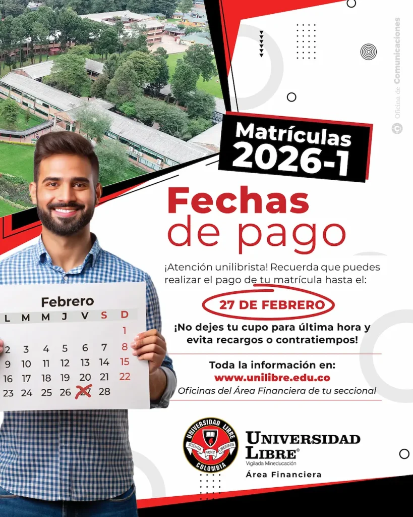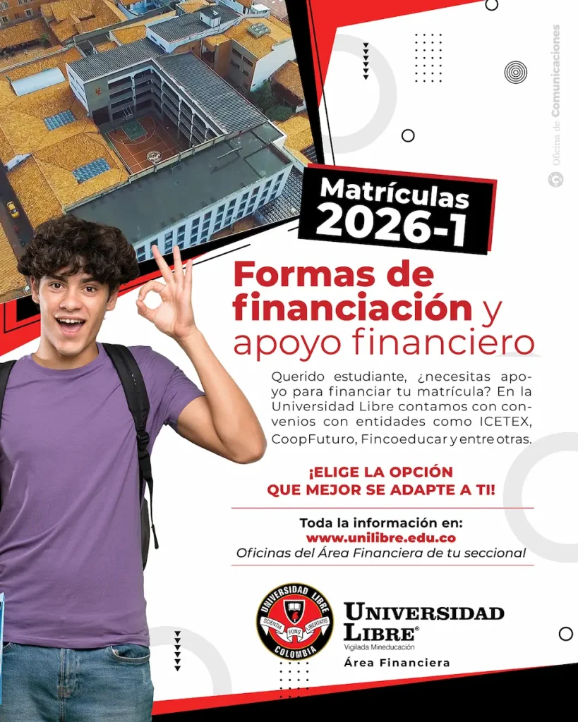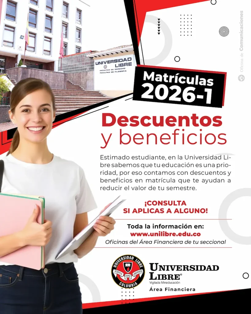 La Universidad Libre informa a sus estudiantes que ya se encuentra disponible toda la información relacionada con el proceso de matrículas para el periodo académico 2026-1, el cual incluye descuentos, beneficios y distintas alternativas de financiación, con el propósito de apoyar la permanencia y el acceso a la educación superior.