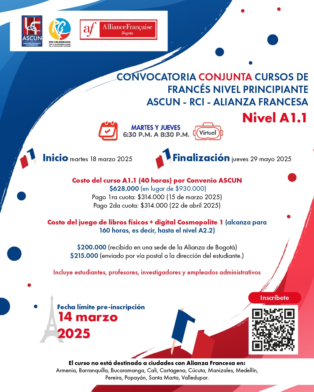La Asociación Colombiana de Universidades (ASCUN) y su Red para la Internacionalización de la Educación Superior (RCI) tienen el gusto de anunciar la apertura de inscripciones para los cursos de francés nivel A1.1 en alianza con la Alianza Francesa de Bogotá.