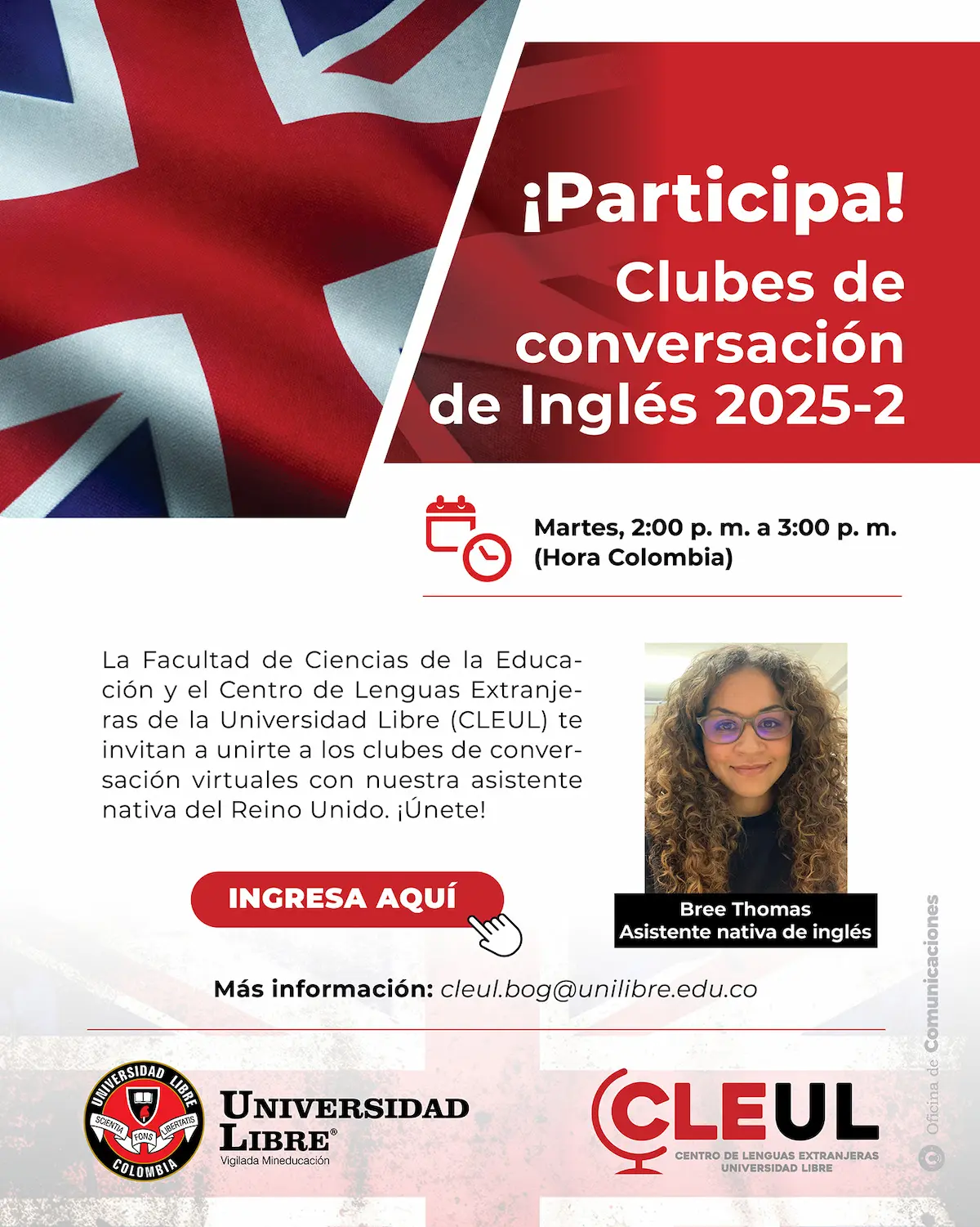 El Centro de Lenguas Extranjeras de la Universidad Libre (CLEUL) invita a la comunidad unilibrista a participar en los clubes de conversación virtuales de inglés, una oportunidad para fortalecer tus habilidades comunicativas en un ambiente dinámico y práctico.