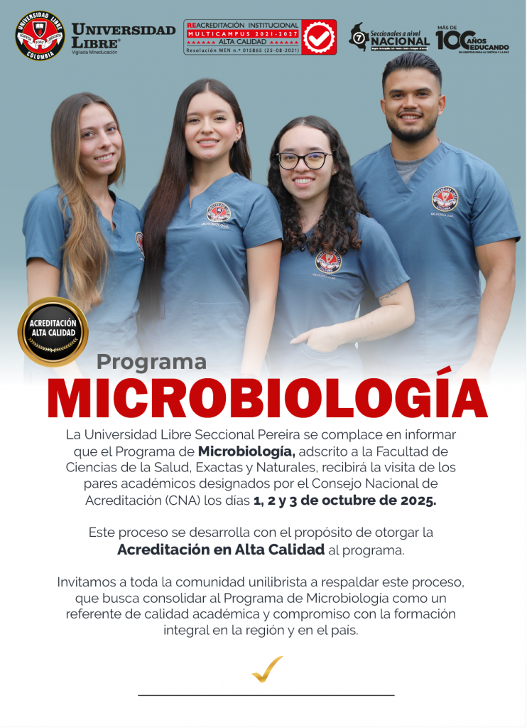 La Universidad Libre Seccional Pereira se complace en informar que el Programa de Microbiología, adscrito a la Facultad de Ciencias de la Salud, Exactas y Naturales, recibirá la visita de los pares académicos designados por el Consejo Nacional de Acreditación (CNA) los días 1, 2 y 3 de octubre de 2025.