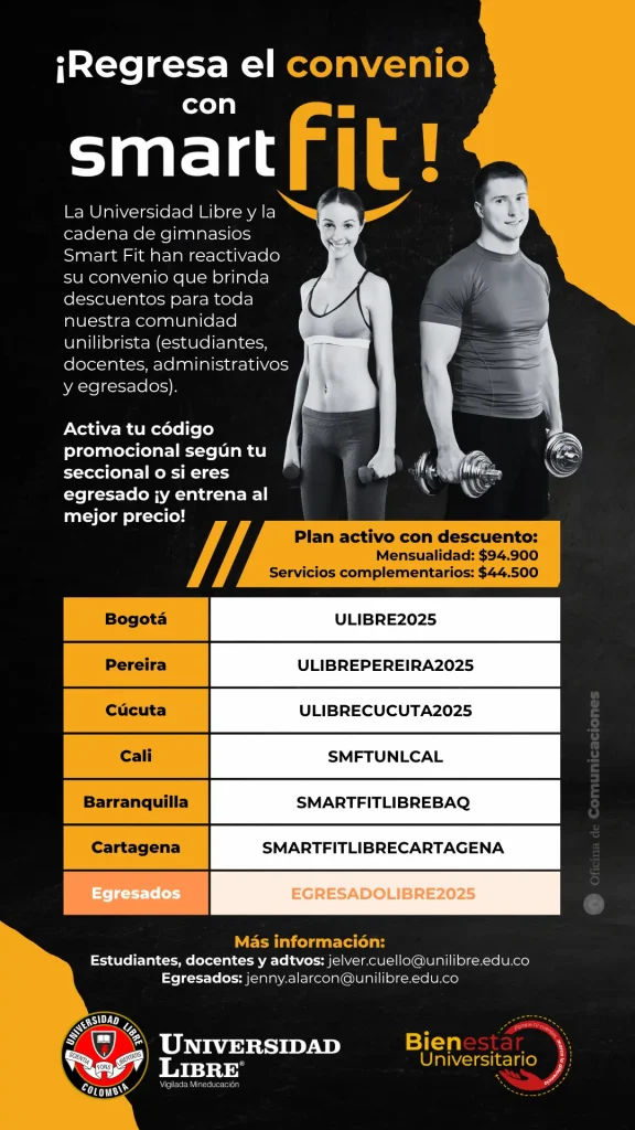 El convenio de la Universidad Libre con la cadena de gimnasios Smart Fit se reactiva. Una alianza que ofrece tarifas preferenciales a estudiantes, docentes, administrativos y egresados de todas las seccionales de la Libre a nivel nacional. Con esta renovación, la comunidad unilibrista podrá acceder a planes especiales que facilitan el entrenamiento físico con precios más accesibles y beneficios adicionales.