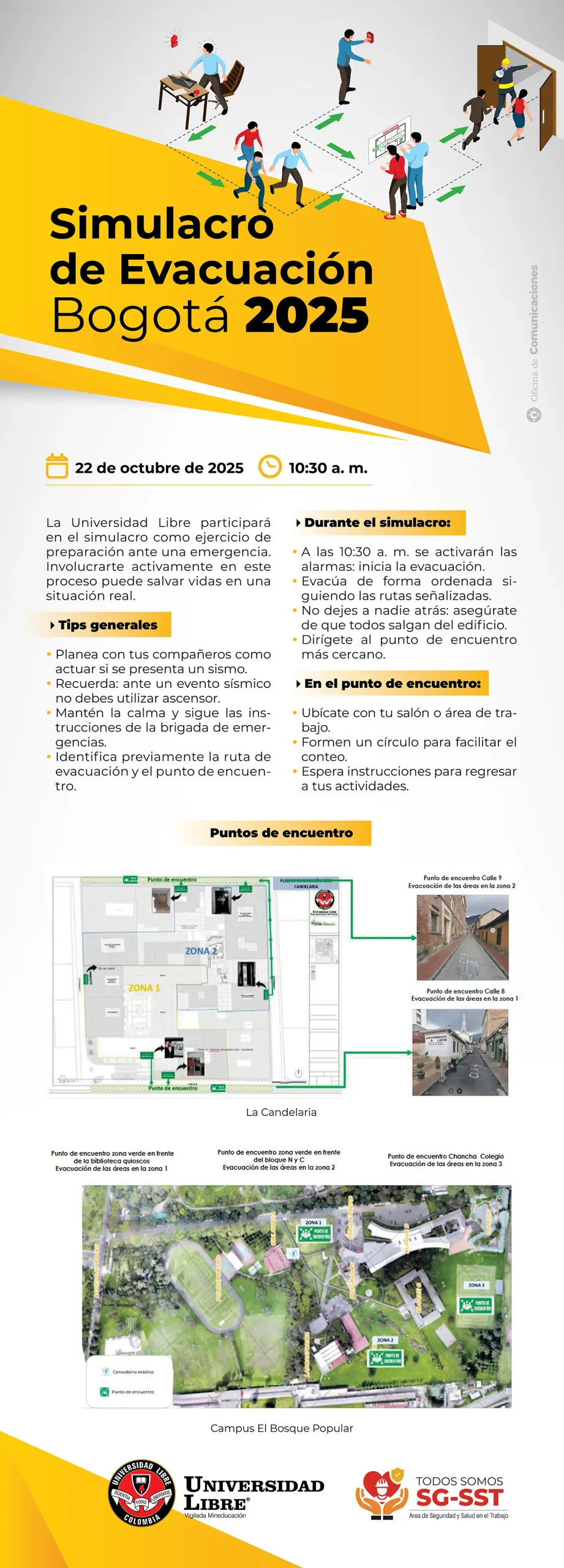 El próximo miércoles 22 de octubre de 2025, a las 10:30 a. m., la Universidad Libre participará en el Simulacro de Evacuación de Bogotá, un ejercicio institucional de preparación ante emergencias que se desarrollará en todas sus sedes de la capital.