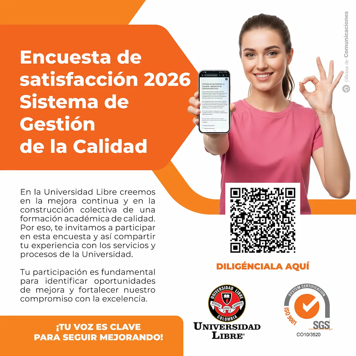 En la Universidad Libre creemos en la mejora continua y en la construcción colectiva de una formación académica de calidad. Por eso, queremos invitarte a diligenciar la Encuesta de Satisfacción 2026 del Sistema de Gestión de la Calidad.