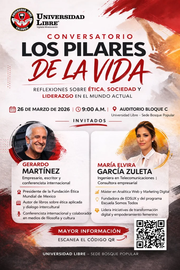 La Universidad Libre invita a toda la comunidad universitaria a participar en el conversatorio “Los pilares de la vida”, un espacio de reflexión y diálogo sobre el pensamiento crítico, la creatividad y la mesura como herramientas fundamentales para el bienestar personal y colectivo.