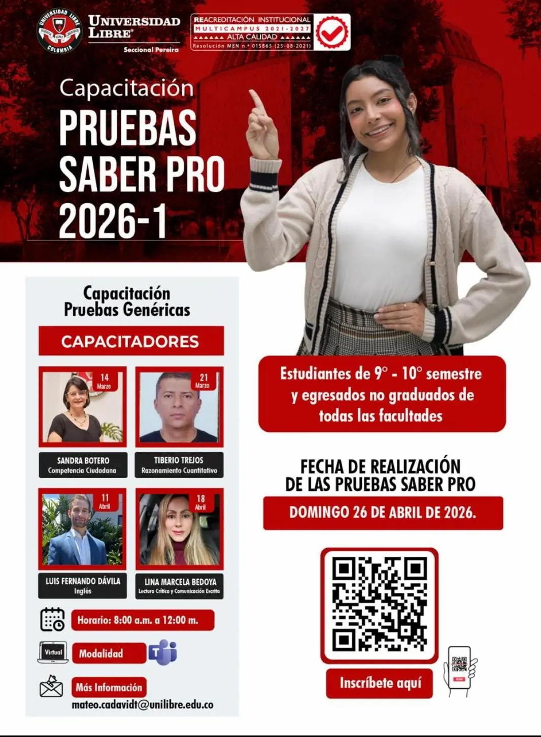 La Universidad Libre adelanta su proceso de capacitación para las Pruebas Saber Pro 2026-1, dirigido a estudiantes de noveno y décimo semestre, así como a egresados no graduados de todas las facultades, con el propósito de fortalecer sus competencias y desempeño en este examen de Estado.