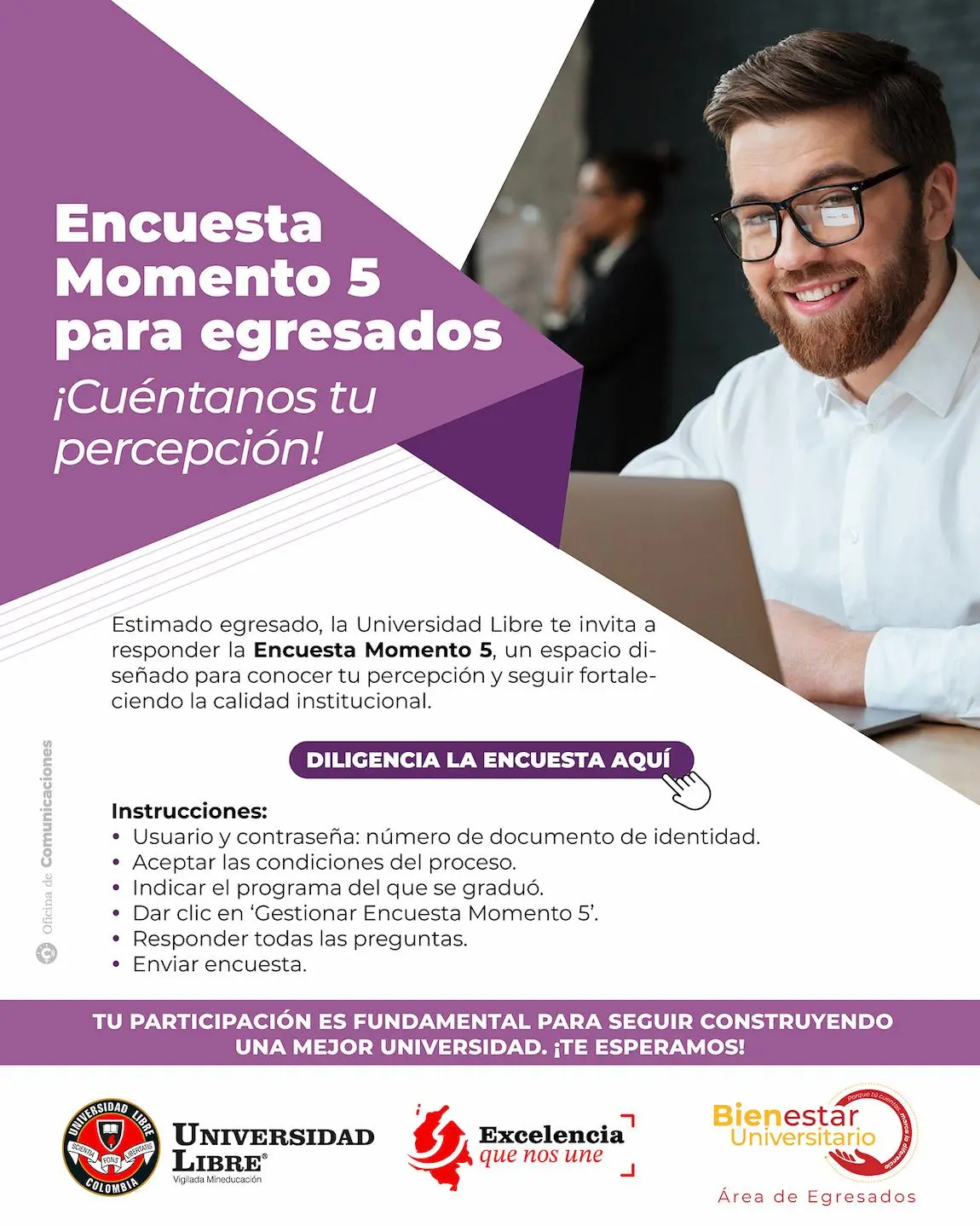 La Universidad Libre, a través de su Área de Egresados, hace un llamado a todos sus graduados para participar en la Encuesta Momento 5, un instrumento institucional que busca conocer la percepción de sus egresados sobre su proceso formativo y su impacto en el ámbito profesional.