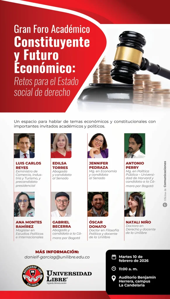 La Universidad Libre llevará a cabo el Gran Foro Académico “Constituyente y Futuro Económico: Retos para el Estado social de derecho”, el próximo martes 10 de febrero de 2026, a las 11:00 a. m., en el auditorio Benjamín Herrera, del campus La Candelaria.