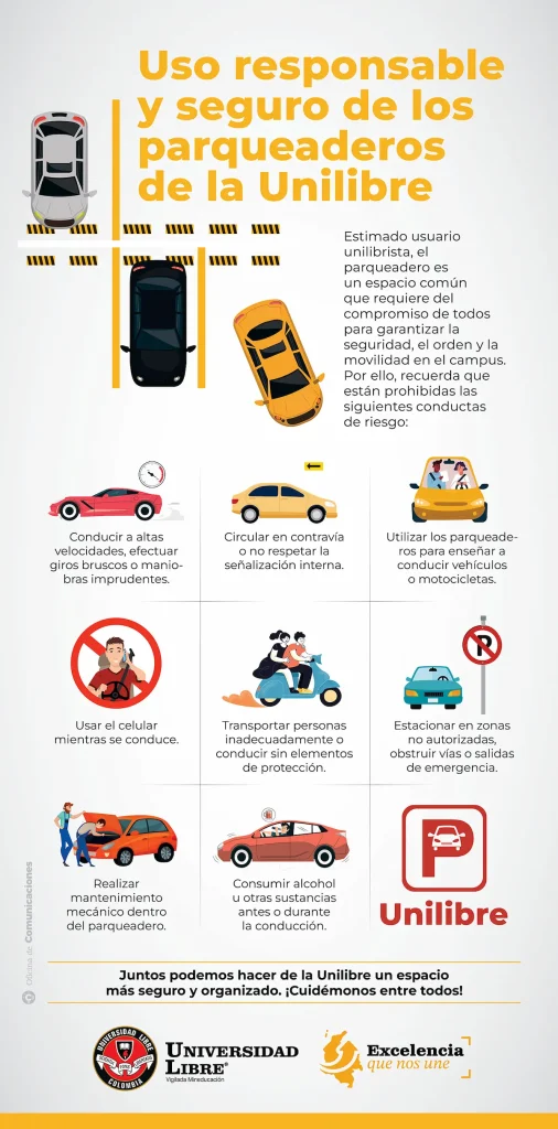 Estimado usuario unilibrista, el parqueadero es un espacio común que requiere del compromiso de todos para garantizar la seguridad, el orden y la movilidad en el campus.