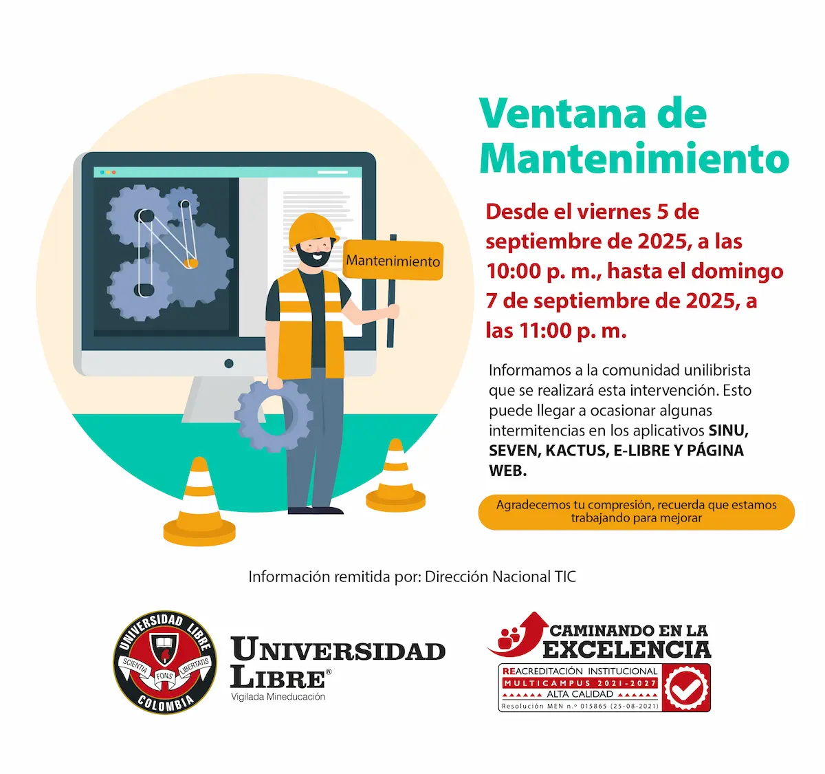 La Dirección Nacional TIC de la Universidad Libre informa a la comunidad unilibrista que, desde el viernes 5 de septiembre de 2025 a las 10:00 p. m., hasta el domingo 7 de septiembre de 2025 a las 11:00 p. m., se llevará a cabo una ventana de mantenimiento en los sistemas institucionales.