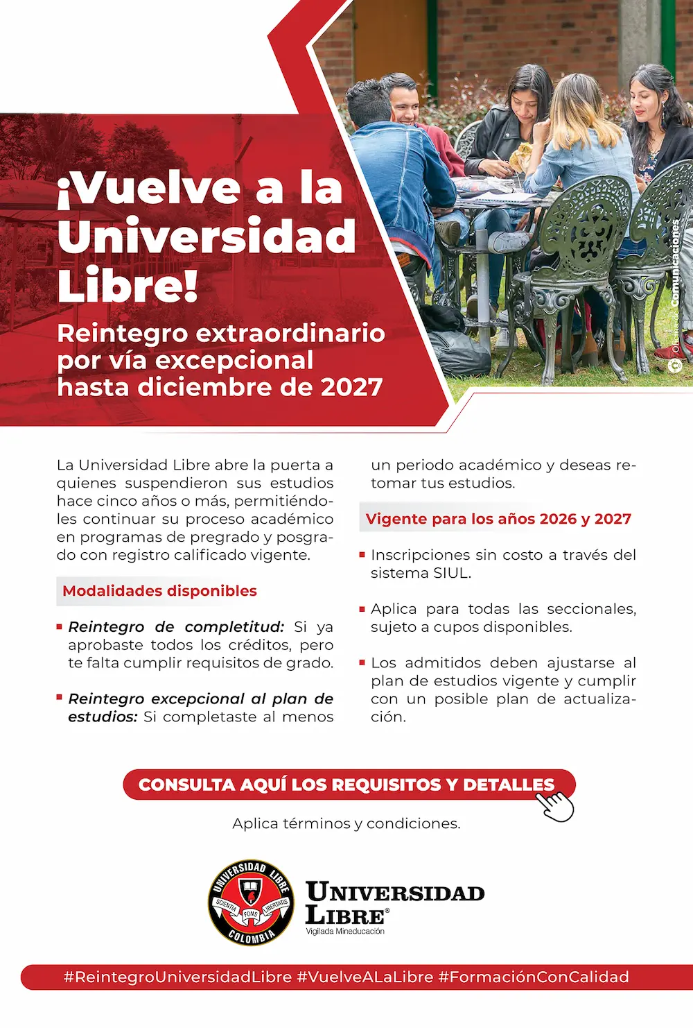 La Universidad Libre abre la puerta a quienes suspendieron sus estudios hace cinco años o más, permitiéndoles continuar su proceso académico en programas de pregrado y posgrado con registro calificado vigente.