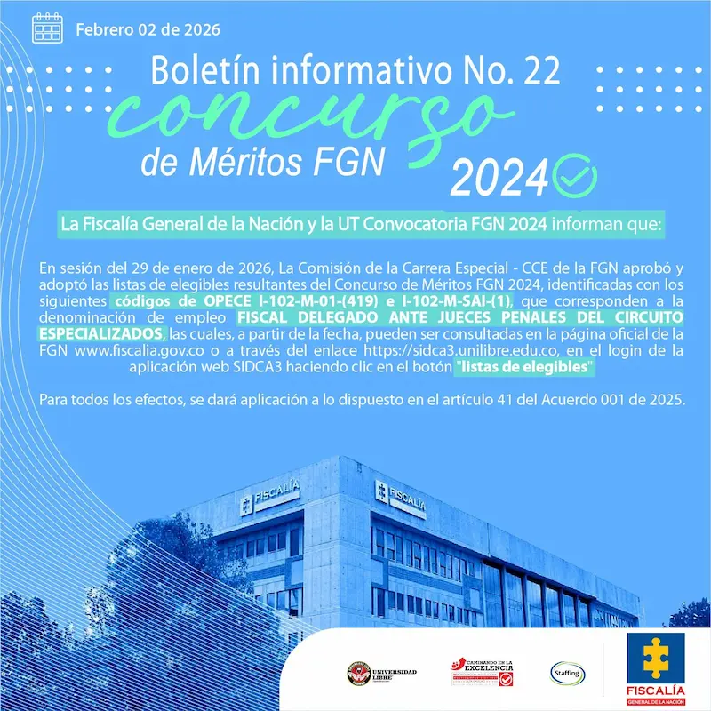 Se informa que el JUZGADO QUINCE ADMINISTRATIVO DEL CIRCUITO JUDICIAL DE CALI, en conocimiento de la acción de tutela, interpuesta por el señor Diego Mauricio Rocha Gallo, identificado con la C.C. No. 3158964, mediante auto de fecha dieciocho de diciembre de 2025, ordena publicar el auto admisorio, con el propósito de darles a conocer la existencia de este trámite, a los inscritos en el Concurso de Mérito FGN 2024, para que si así lo consideran, puedan intervenir dentro de la acción constitucional, otorgándoles un término de (DOS (02)) días.