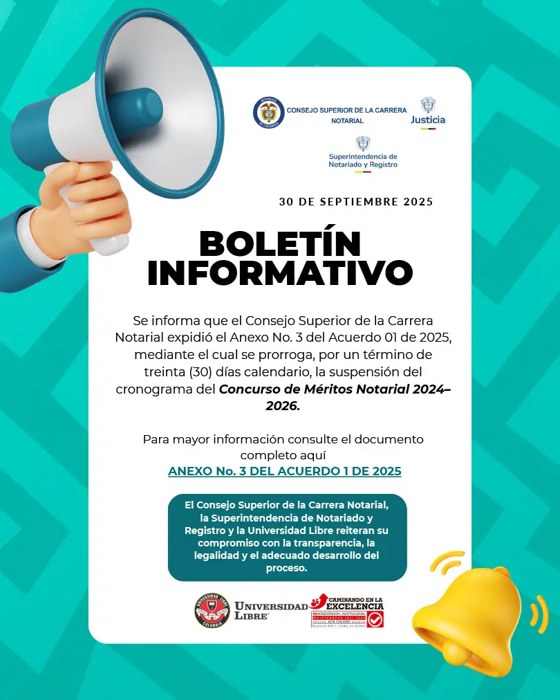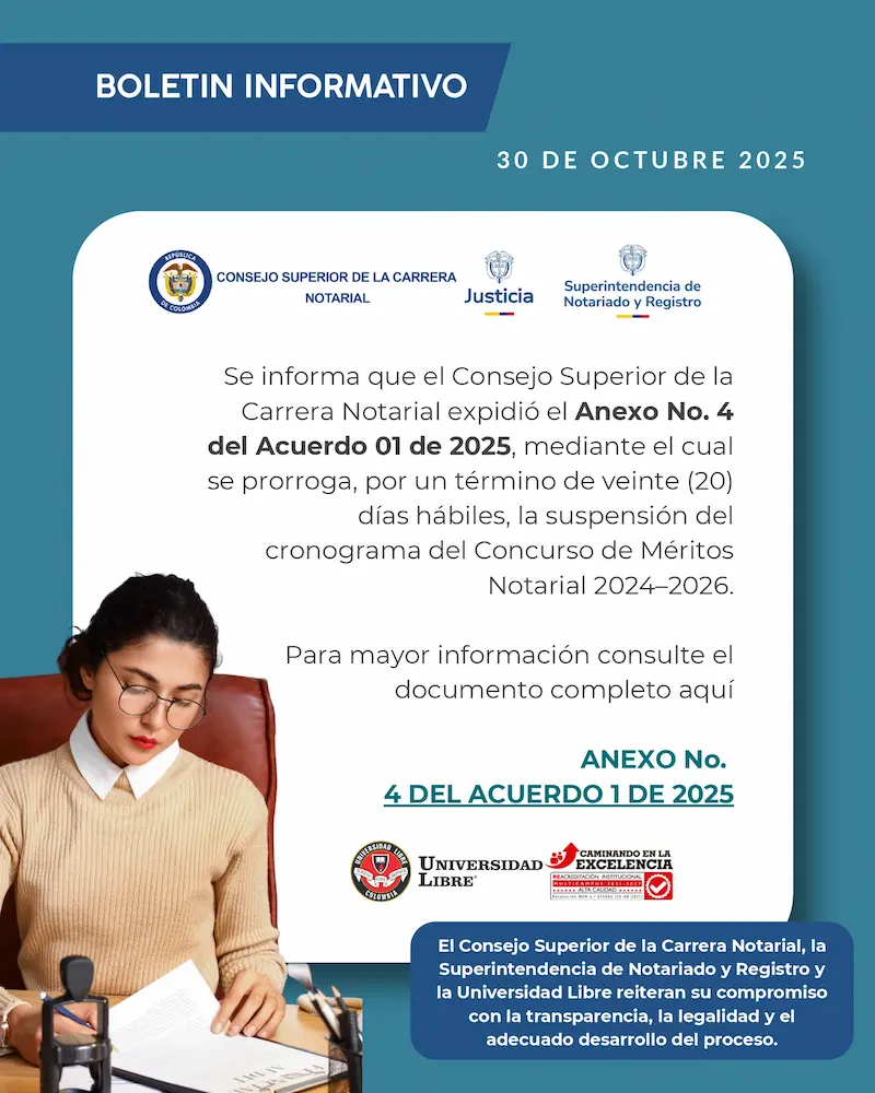 DescargarSe informa que el JUZGADO CUARENTA y CUATRO CIVIL DEL CIRCUITO DE BOGOTÁ, en conocimiento de la acción de tutela, interpuesta por el señor ELKIN YESID MOLINA OROZCO, identificado con la C.C. No. 1053821495, mediante auto de fecha 01 de octubre de 2025, ordena publicar el auto admisorio y el escrito de tutela, con el propósito de darles a conocer la existencia de este trámite, a terceros con interés legítimo en el Concurso de Mérito Notariado.